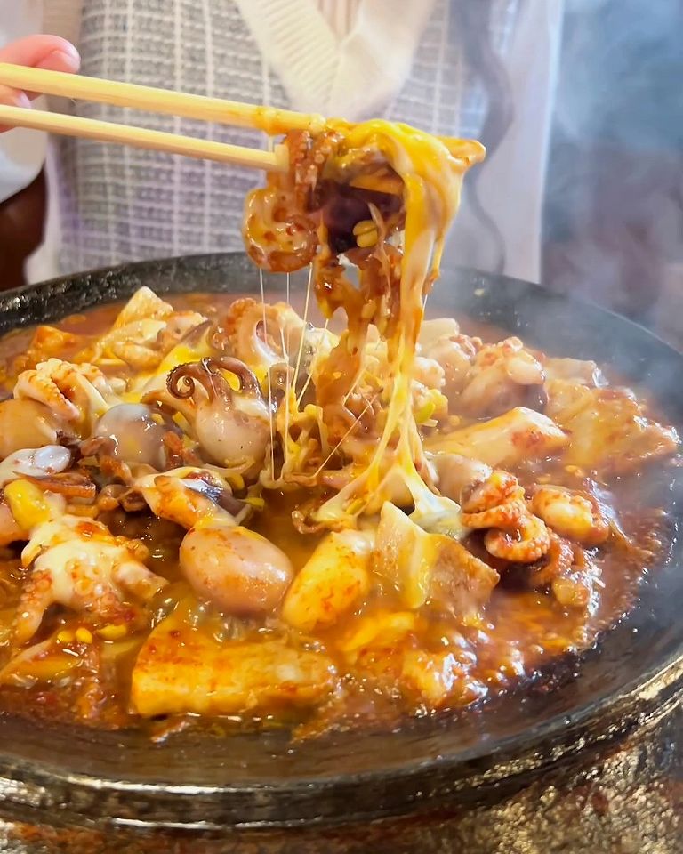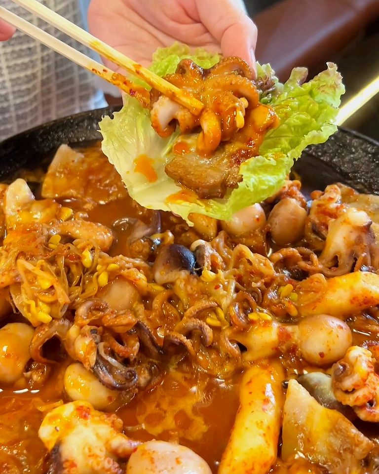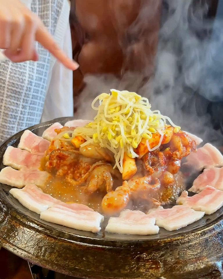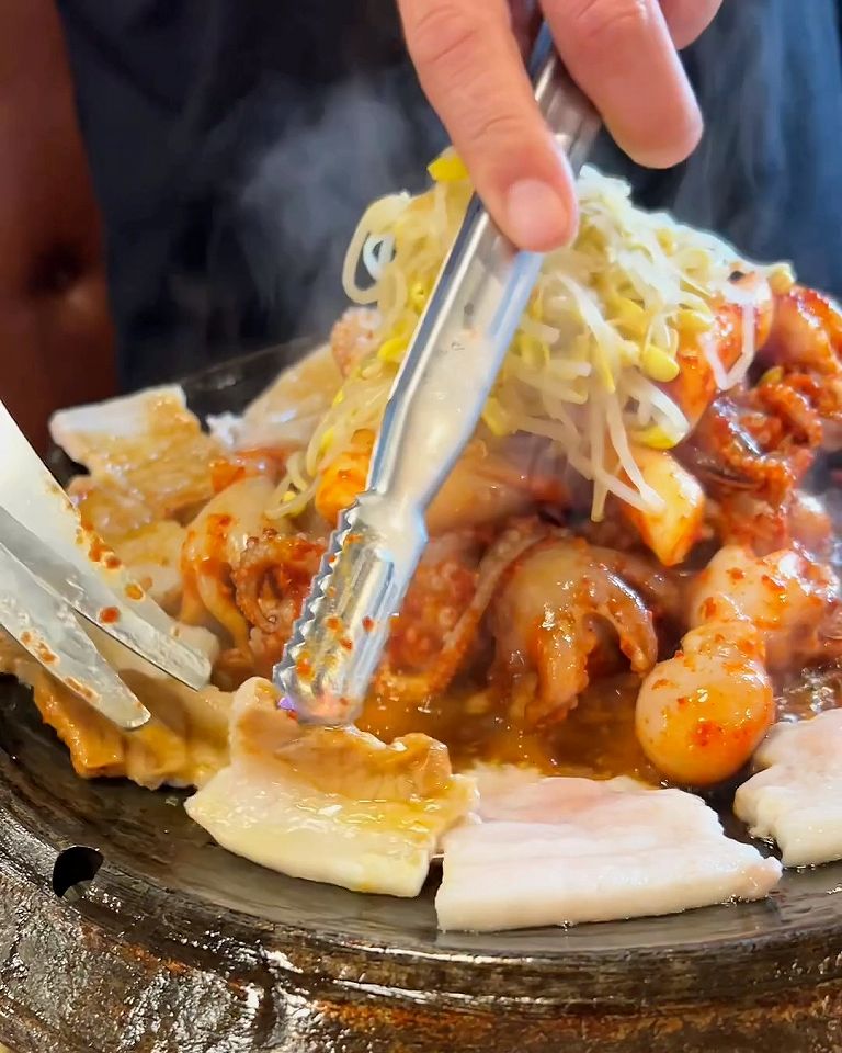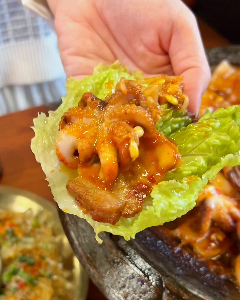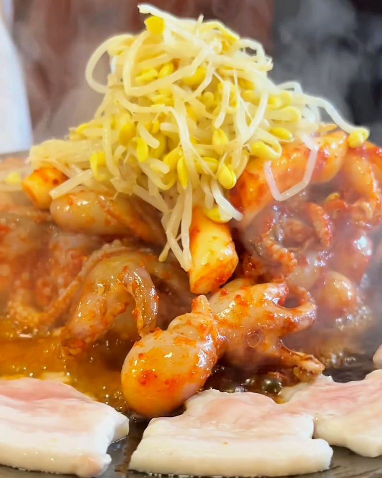 チュクミサムギョプサルは、チュクミ(=イイダコ)とお肉のサムギョプサルで、甘辛くブレンドされたタレとお野菜と一緒に焼いてもらって食べるんですが、これがまたプリプリの食感がたまらないイイダコと、豚肉の甘い脂に、ピリ辛のお味噌のコクと旨みが合わさってもう最高に美味しいんです!魚介とお肉を一度に楽しめる贅沢な組み合わせが魅力です。