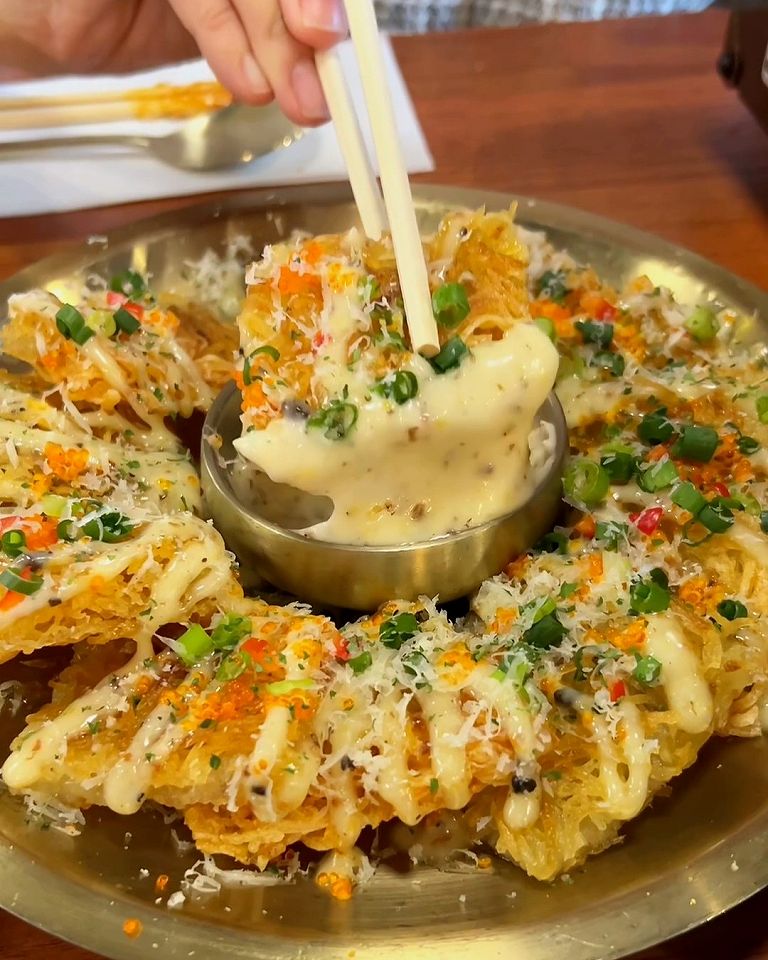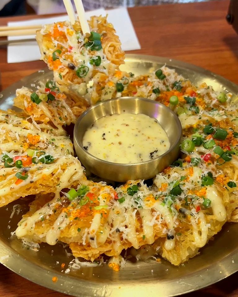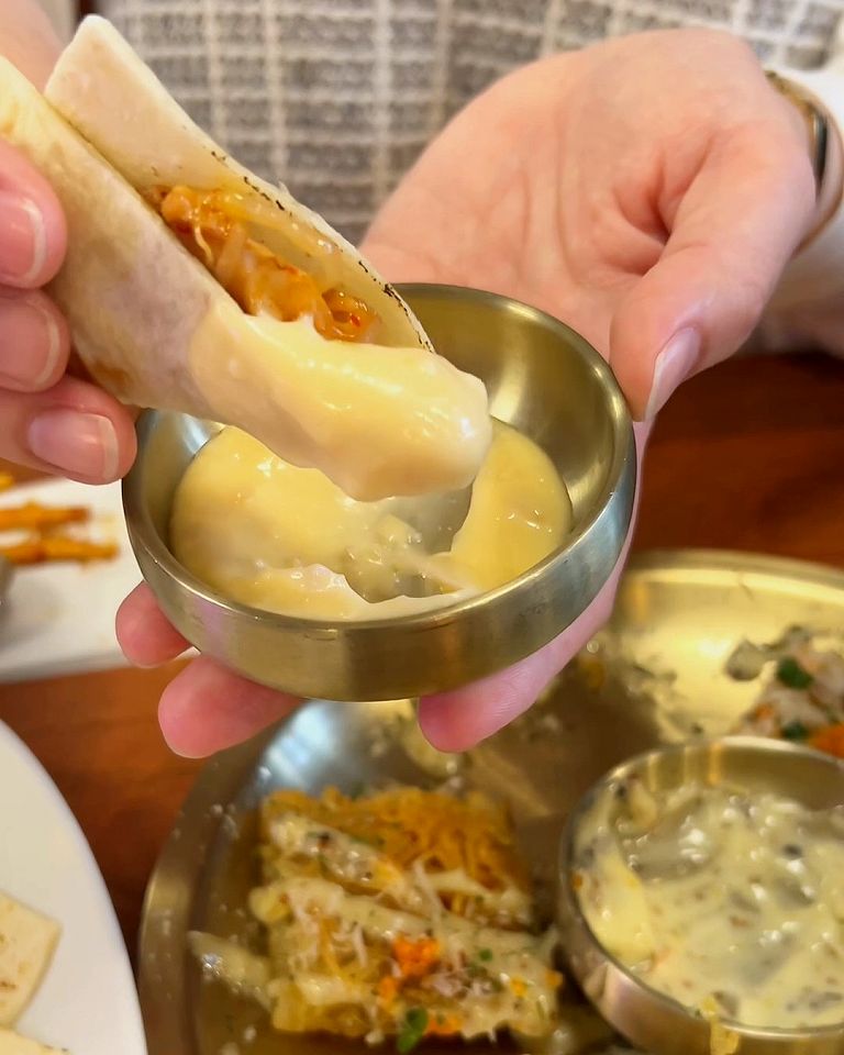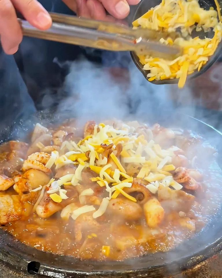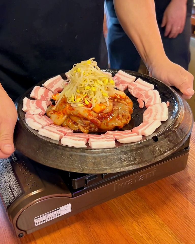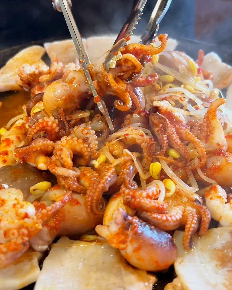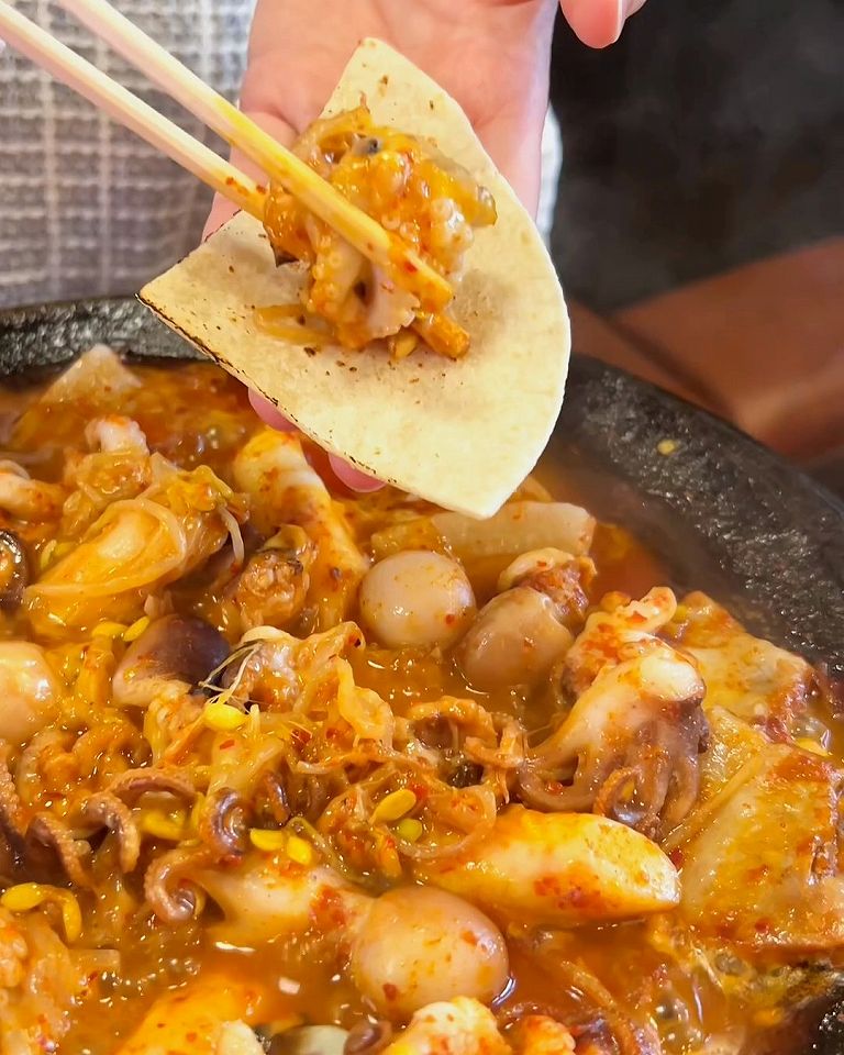 チュクミサムギョプサルは、チュクミ(=イイダコ)とお肉のサムギョプサルで、甘辛くブレンドされたタレとお野菜と一緒に焼いてもらって食べるんですが、これがまたプリプリの食感がたまらないイイダコと、豚肉の甘い脂に、ピリ辛のお味噌のコクと旨みが合わさってもう最高に美味しいんです!魚介とお肉を一度に楽しめる贅沢な組み合わせが魅力です。