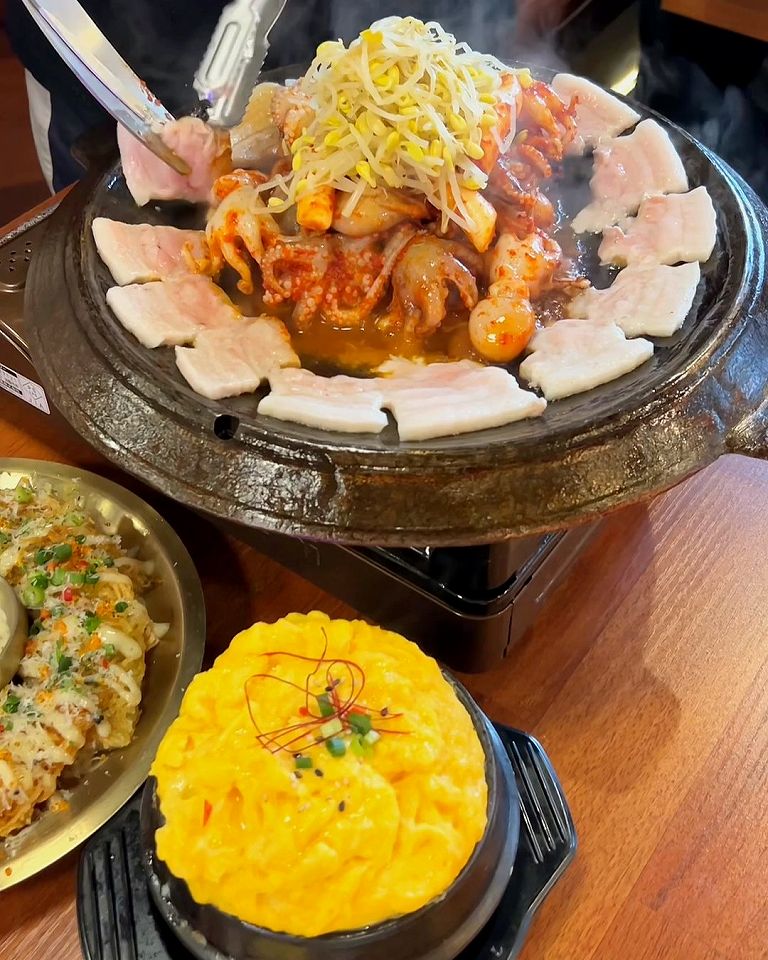 ここで今人気なのがこのチュクミサムギョプサルで、ケランチムやじゃがいもチヂミのセットがオススメです。いろいろなセットメニューがあって、グループで来ても楽しめます。